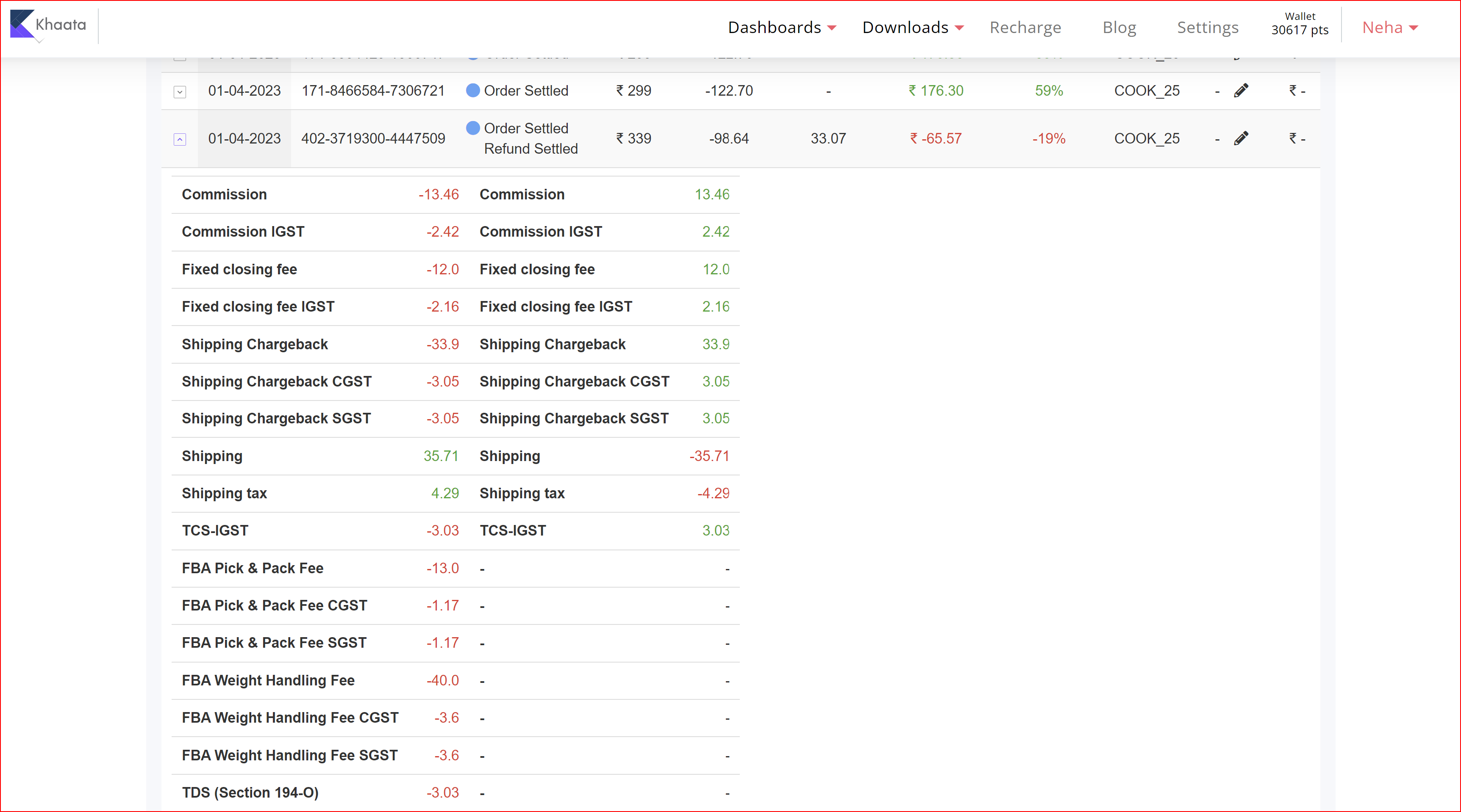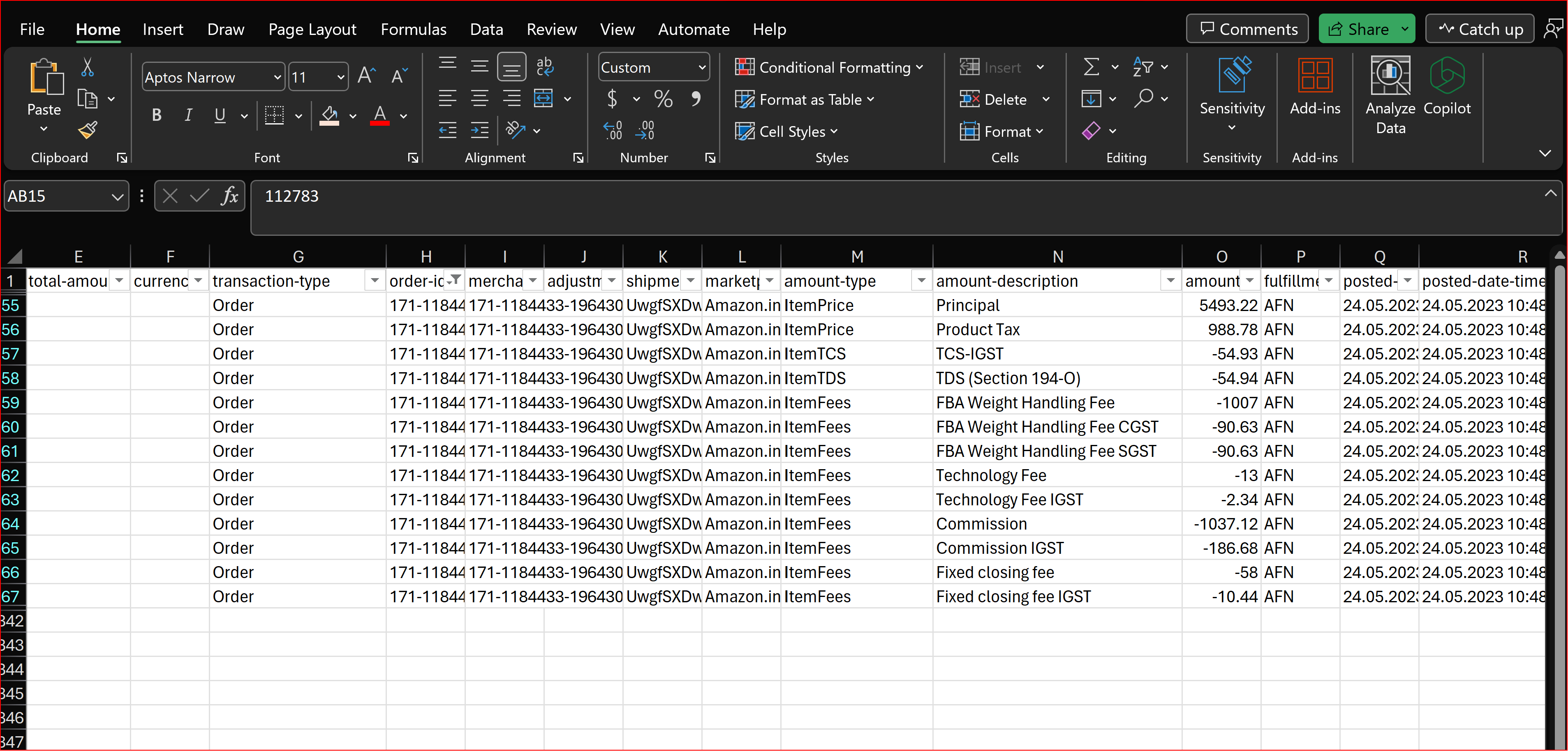 Let’s take a look at Amazon’s payment reconciliation excel sheet. Each order has a value equal to the sum of item value, item tax and shipping. And then there are commissions and taxes deducted on them.
